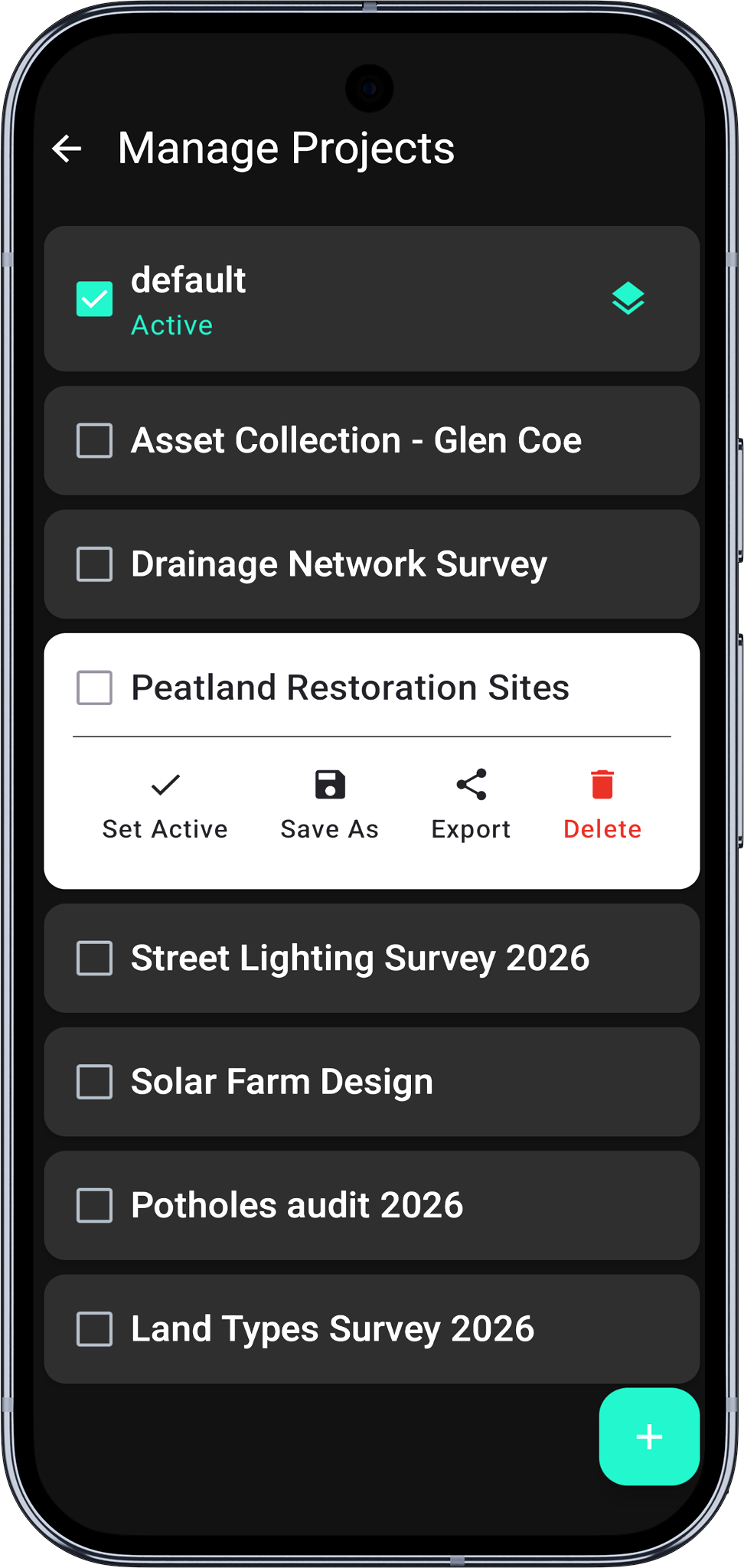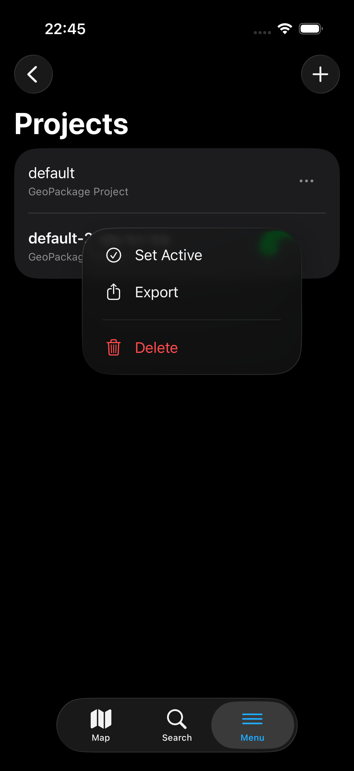 Exporting a project creates a complete copy of your GeoPackage database - including all layers, features, attributes, styles, offline maps, and online service definitions. The exported .gpkg file can be used for backup, transferred to another device, or opened directly in desktop GIS software such as QGIS or ArcGIS.