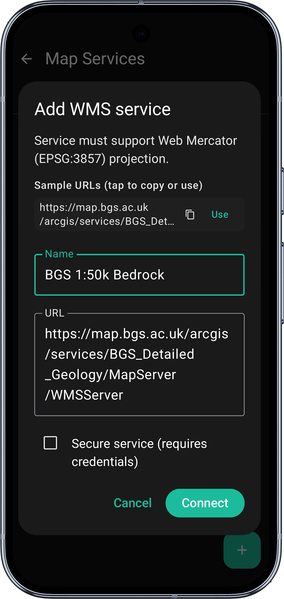 Adding a custom online map service is straightforward: tap the "+" icon in the "Online Maps" menu. Depending on the service type, you may be prompted to provide additional information, such as the service name and endpoint URL. For example, when configuring a WMS layer, simply specify a descriptive name and the WMS service URL before proceeding by tapping "Connect."